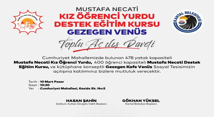 Kartal Belediyesi’nin en önemli yatırımlarından olan Mustafa Necati Destek Eğitim Kursu, Mustafa Necati Kız Öğrenci Yurdu ve Venüs Gezegen Kafe’nin açılışı, Cumhuriyet Halk Partisi Genel Başkanı Özgür Özel’in katılımı ile gerçekleştirilecek. Muhteşem bir organizasyon ile düzenlenecek olan açılış töreni; 10 Mart Pazar günü, saat 10.30’da Cumhuriyet Mahallesi, Kaside Sokak’ta yapılacak.