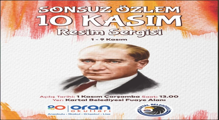 Kartal Belediyesi, 10 Kasım Atatürk’ü Anma ve Atatürk Haftası kapsamında, anlamlı bir etkinliğe ev sahipliği yapıyor. Kartal Belediyesi ve Oran Okulları işbirliği ile düzenlenecek olan “Sonsuz Özlem 10 Kasım” isimli resim sergisi Kartal Belediyesi Fuaye Alanı’nda gerçekleştirilecek. Serginin açılışı 1 Kasım Çarşamba günü saat 13.00’de yapılacak. Öğrencilerin tuvallerine yansıyan resimler sergide yerini alacak. Sergi 1-9 Kasım tarihleri arasında açık kalacak.